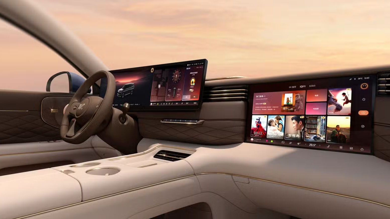 Der Innenraum ist voller Bildschirme. Fahrer und Beifahrer teilen sich einen riesigen 27,1-Zoll-5K-MiniLED-Bildschirm, der Fahrinformationen und Fahrzeugsteuerung verwaltet. Auch der Beifahrer verfügt zur Unterhaltung über einen eigenen 15,6 Zoll großen 3K-MiniLED-Bildschirm. Der Innenraum verfügt über ein schlankes, aufgeräumtes Design, wobei die Lüftungsschlitze geschickt in das Armaturenbrett integriert sind.