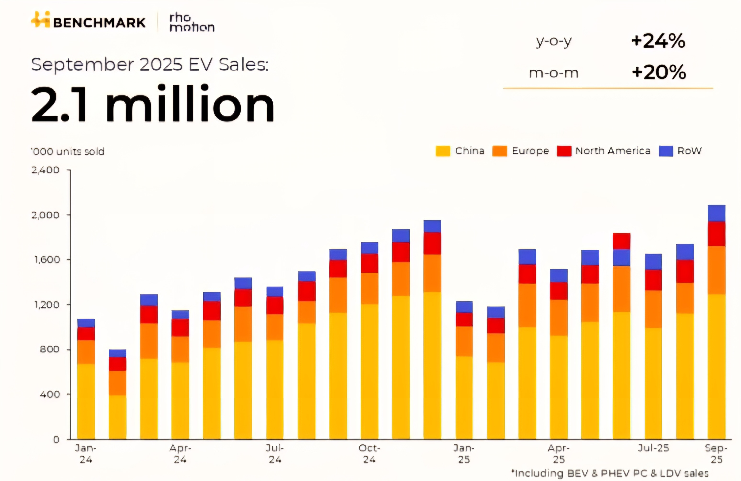 Der Absatz von Elektroautos erreichte im September 2025 mit weltweit 2,1 Millionen verkauften Fahrzeugen einen neuen Höchststand – mehr als in jedem anderen Monat seit Beginn der Aufzeichnungen. Dieser Anstieg war größtenteils auf die gestiegene Nachfrage und staatliche Unterstützung in China, Europa und Nordamerika zurückzuführen. Während die weltweiten Verkäufe immer noch steigen, könnte sich das Wachstum in den Vereinigten Staaten verlangsamen, da die Steuergutschriften auslaufen, was die Automobilhersteller dazu veranlassen würde, die Produktion zu drosseln.