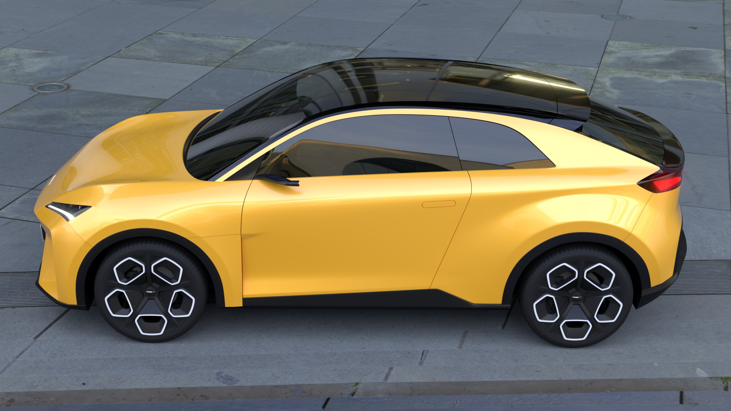 Die Idee ersetzt herkömmliche Spiegel durch optimierte Kamerasysteme, die stattdessen auf den A-Säulen installiert sind. Bemerkenswerterweise befinden sich die doppelten silber- und schwarzen Felgen unter merklichen Radbohrungen, insbesondere auf der Rückseite, was dem EVX ein durchsetzungsfähiges und geerdetes Erscheinungsbild verleiht.