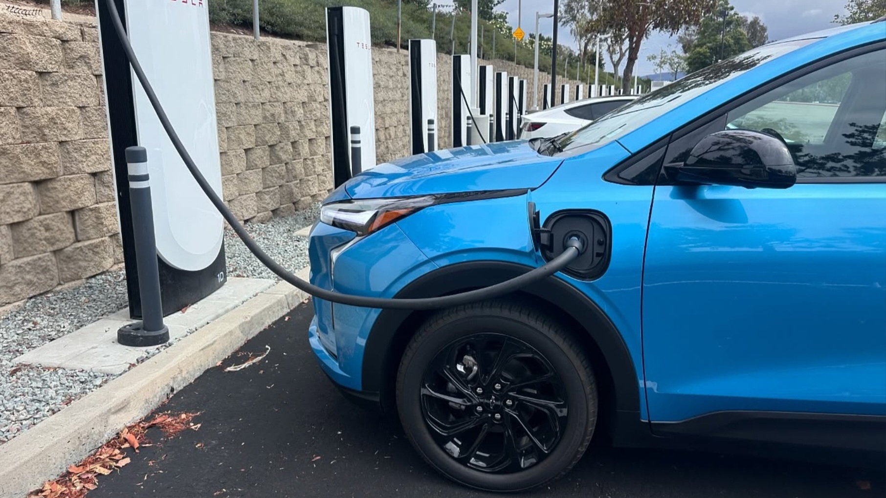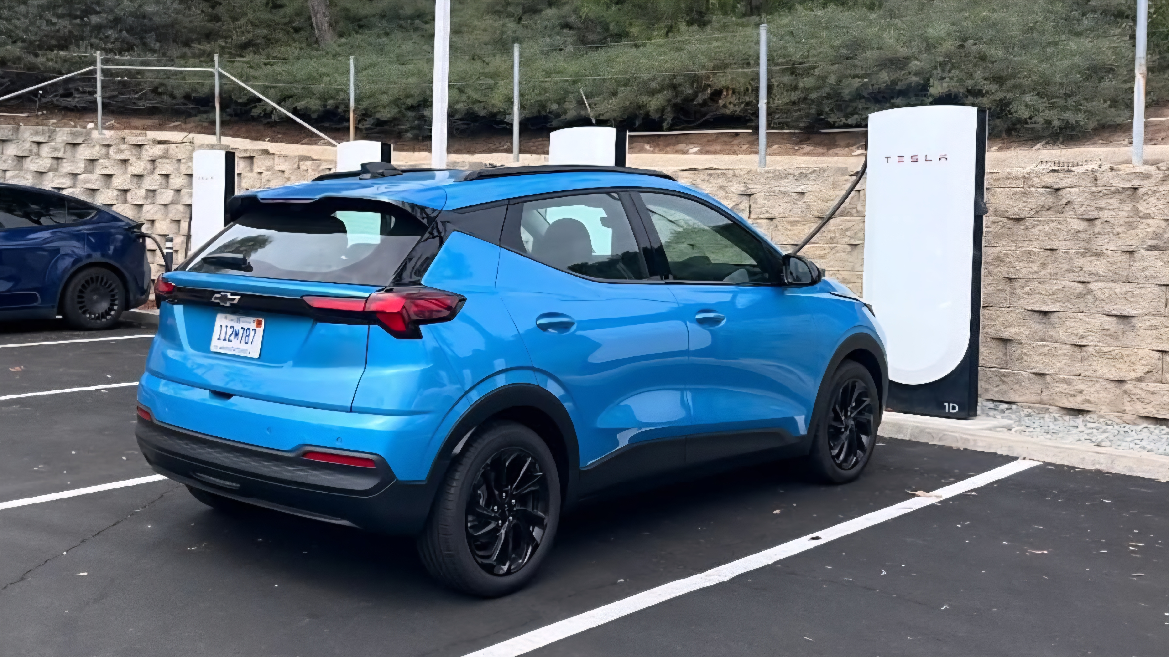 Eine leuchtend blaue Testversion des neuen Bolt EV wurde bei einem Tesla -Supercharger aufgeladen. Dies zeigt, wie sich die Dinge für Elektrofahrzeuge ändern, da der Bolzen seinen NACS -Ladeanschluss verwendete – ein Typ, der in vielen Automarken bald üblich sein wird.