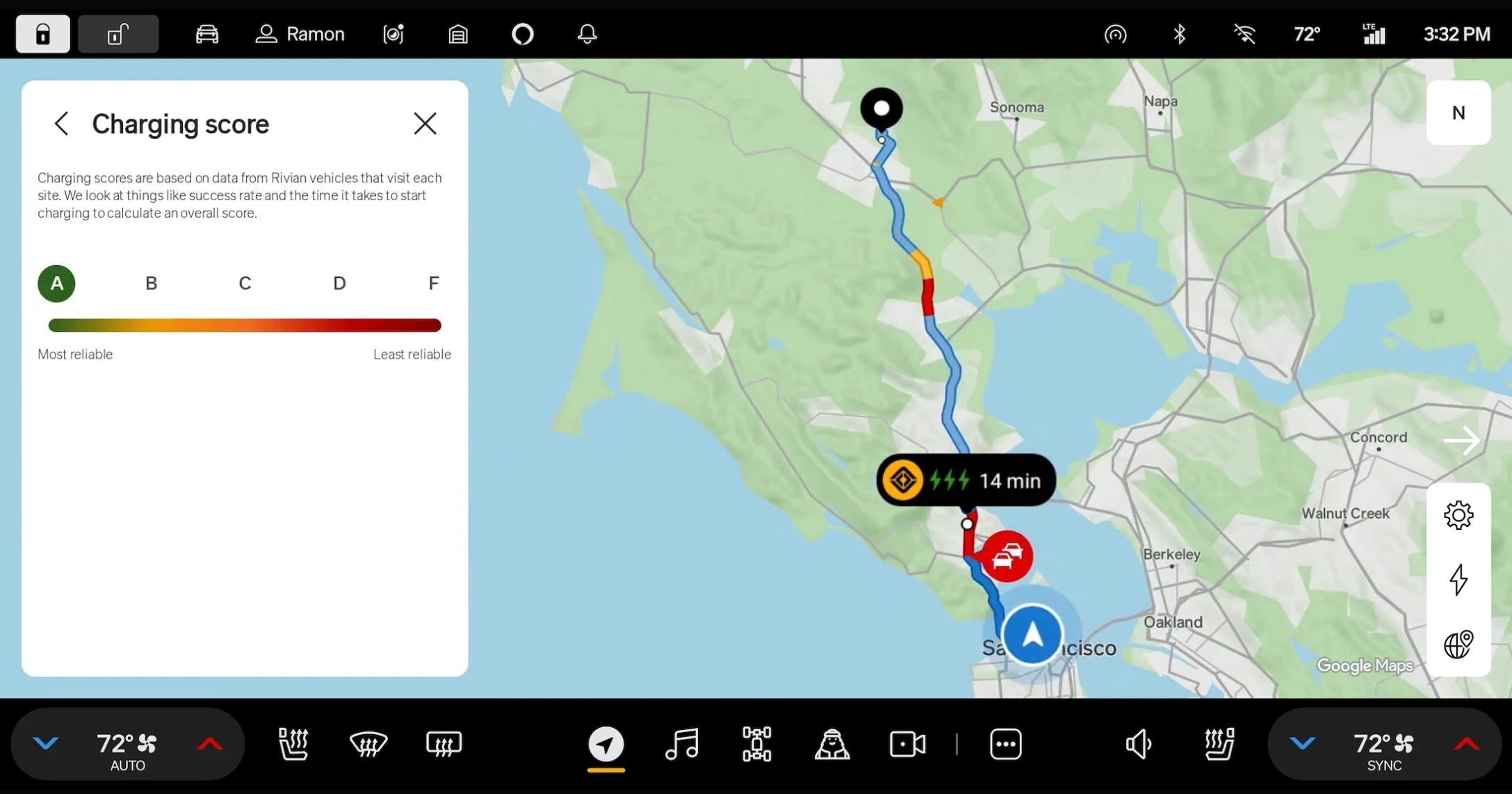 Das exklusive „Lade-Score“ -System von Rivian bewertet einzelnen Ladestationen mithilfe von Plug-in-Daten von anderen Rivianen von anderen Rivian-Fahrzeugen. Diese Punktzahl bietet Fahrern einen Live-Schnappschuss für die Zuverlässigkeit einer bestimmten Station, bevor sie überhaupt dort ankommen, und hilft ihnen, sich von nicht funktionierenden Ladegeräten fernzuhalten.