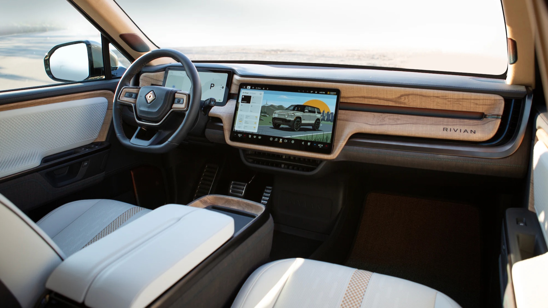 Unter den charakteristischen Innenelementen finden Sie Sprechergrilles und Bodenmatten mit einem Gradienteneffekt, der von einem atemberaubenden pazifischen Sonnenuntergang inspiriert ist. Dieses Design kombiniert harmonisch blaublau, lebendig rot und goldgelb – die legendären Farben von Rivian’s Adventure Department.