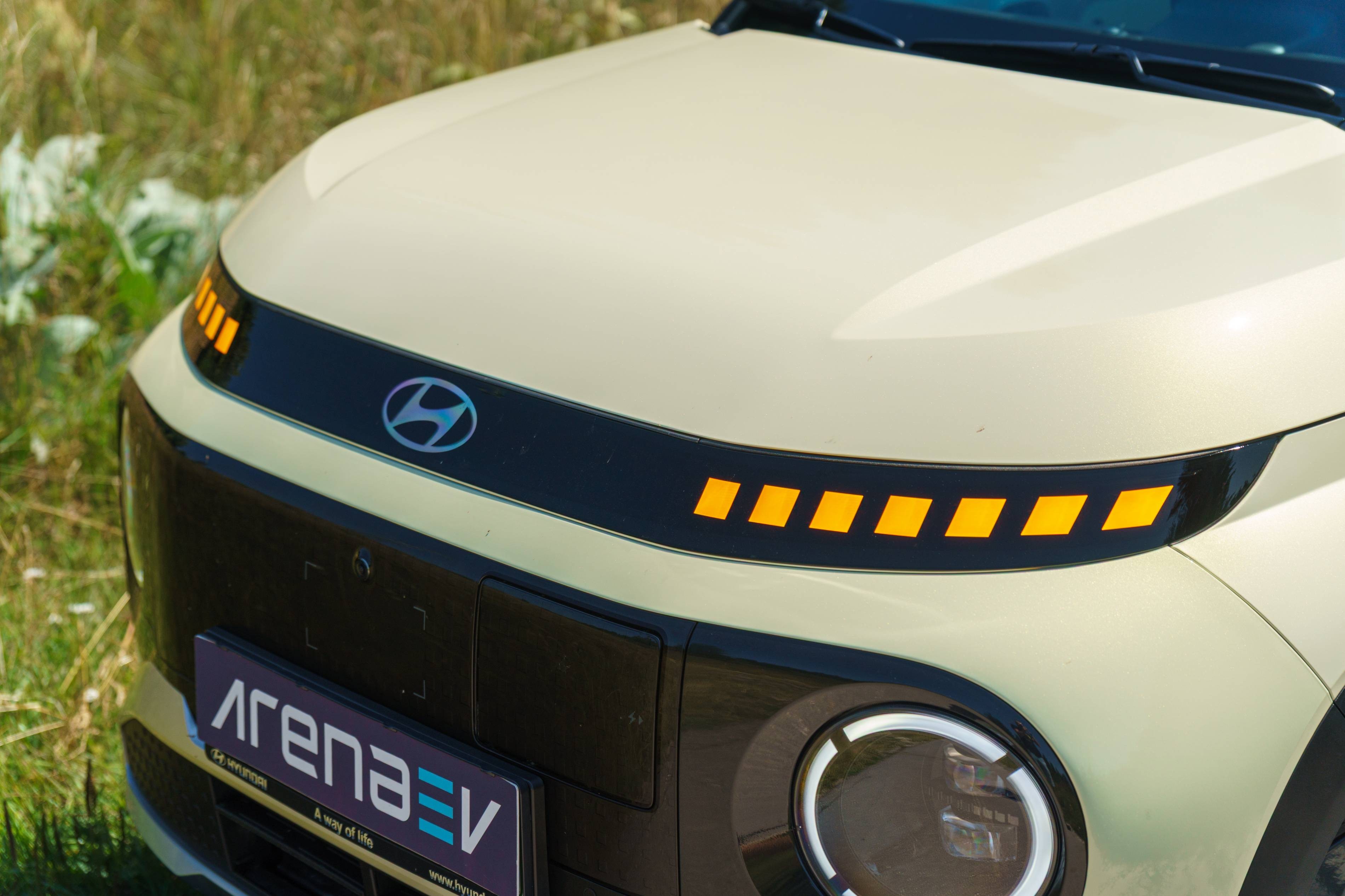 Der Hyundai Insster hat ein einladendes und fröhliches Front -Design, vor allem dank seiner großen runden Lauflichter. Dies verleiht ihm einen niedlichen und zugänglichen Look, der im Vergleich zu vielen heutigen Autos mit aggressivem Styling auffällt. Die Scheinwerfer selbst sind in diese Lauflichter integriert.