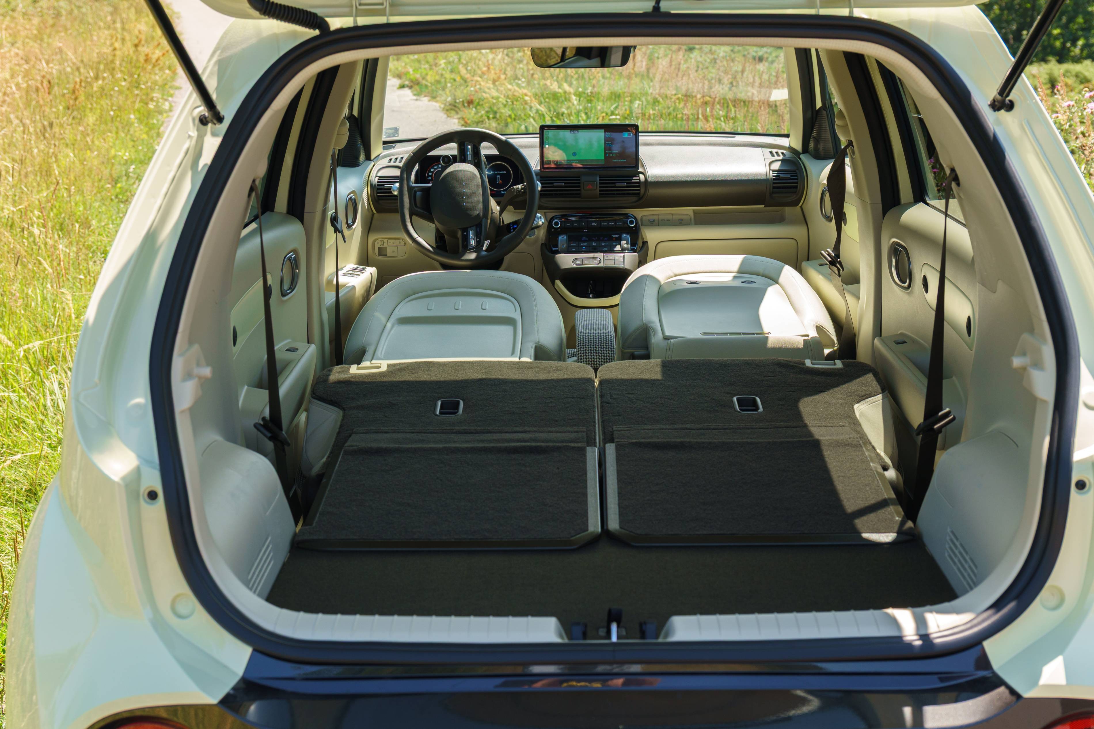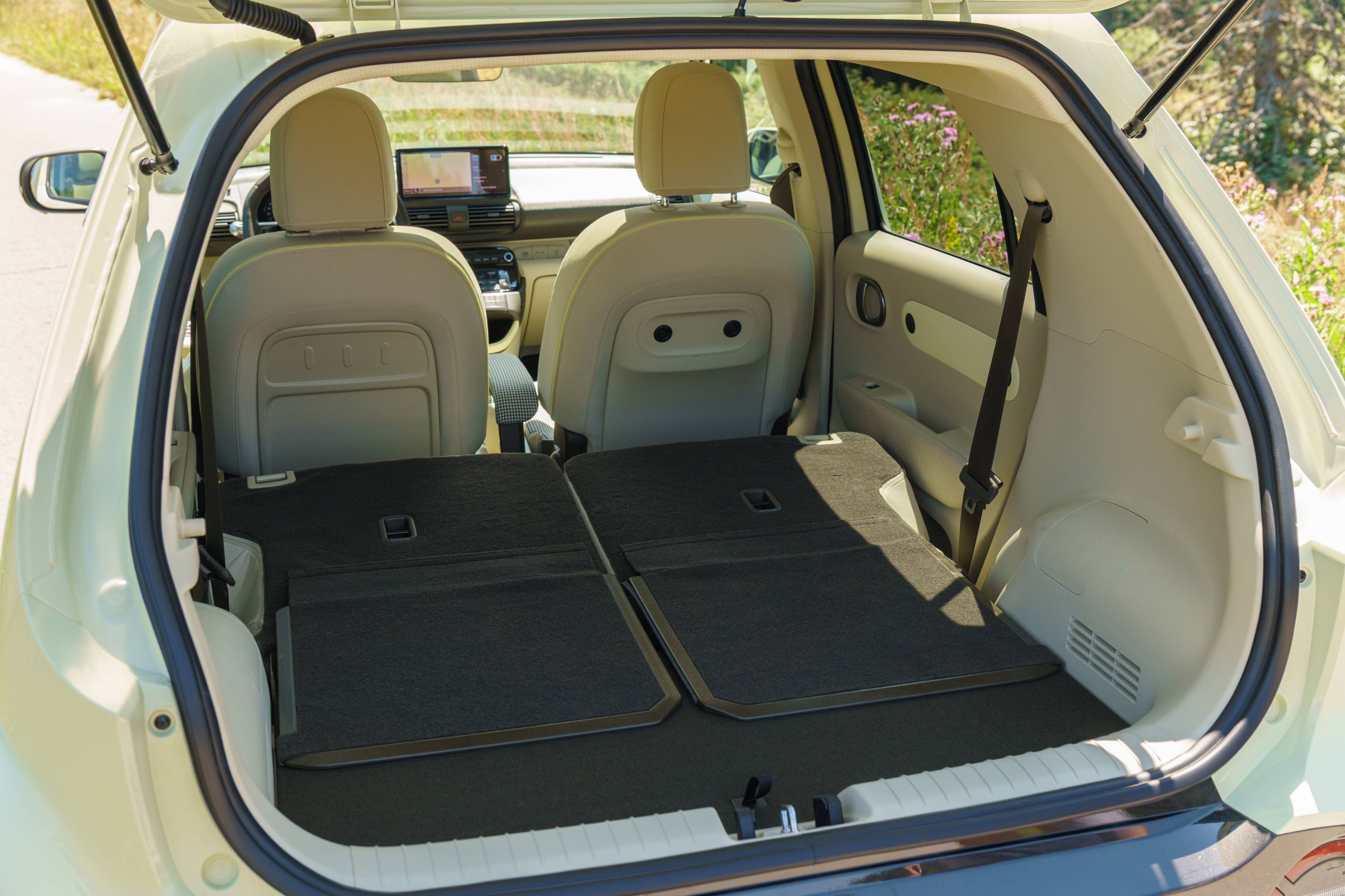 Wenn die hinteren Sitze heruntergeklappt sind, bietet der Inster deutlich mehr Laderaum als die meisten Konkurrenten. Die Sitze liegen völlig flach mit dem Kofferraumboden, so dass es einfach ist, lange Gegenstände zu laden, und der Gesamtraum dehnt sich auf großzügige 37,4 Kubikfuß aus – fast so viel wie ein mittelgroßer SUV. Das clevere Innenarchitektur des Insters ist wirklich beeindruckend und verdient Anerkennung.