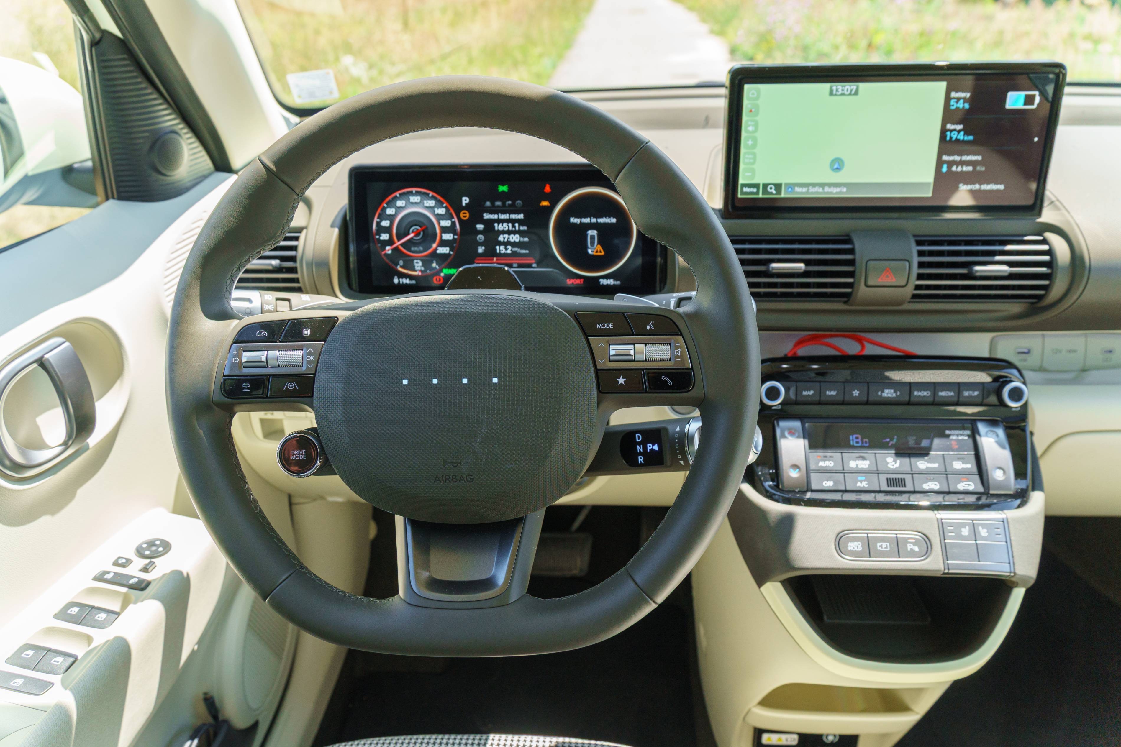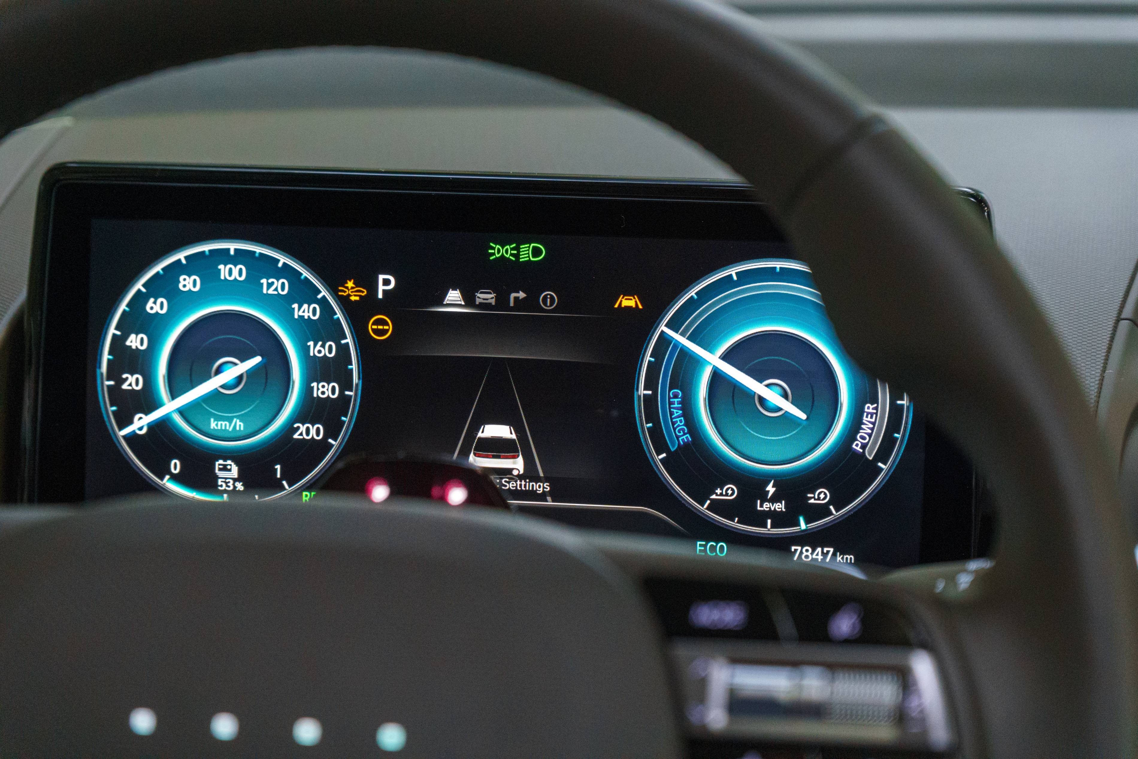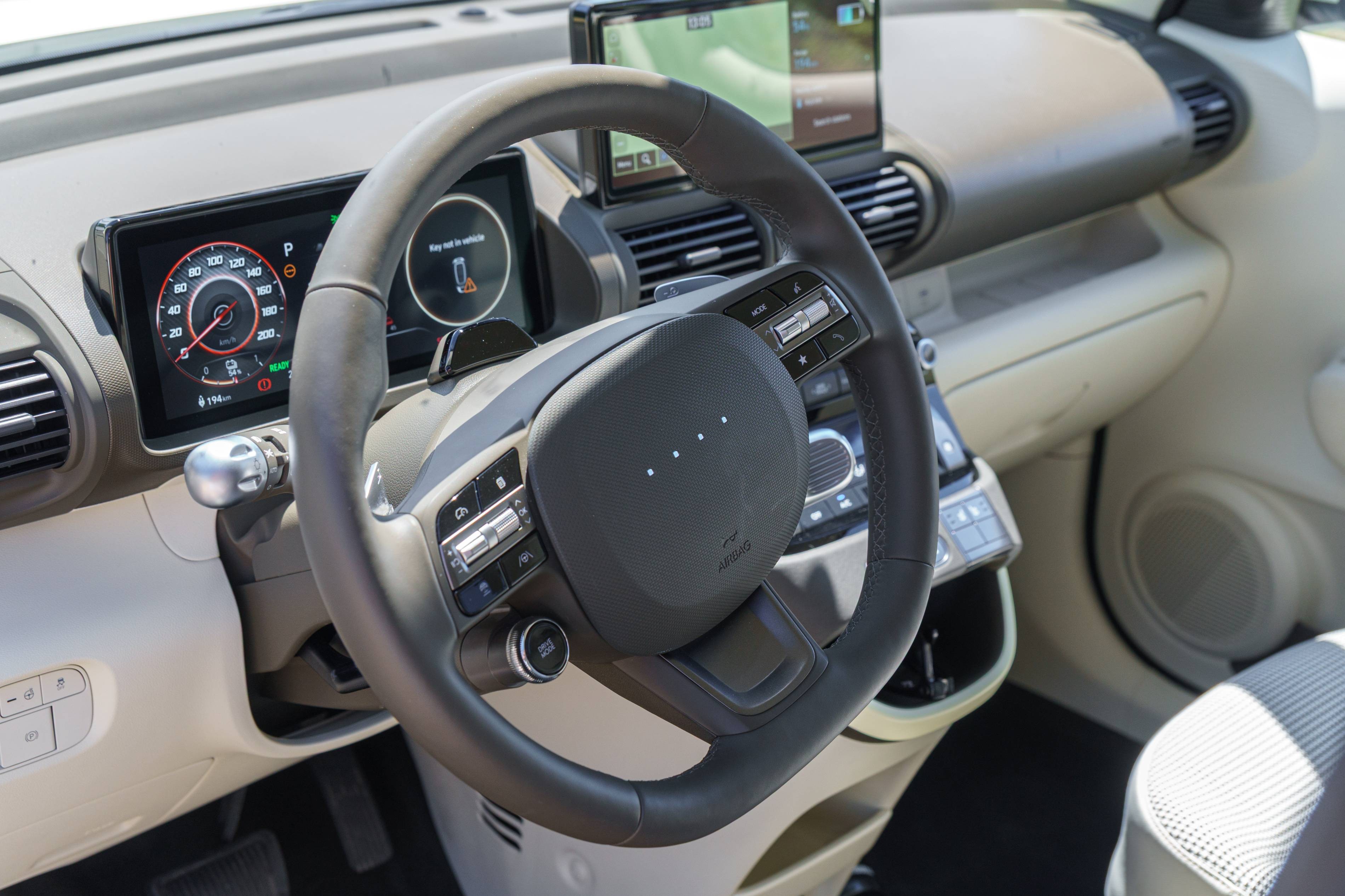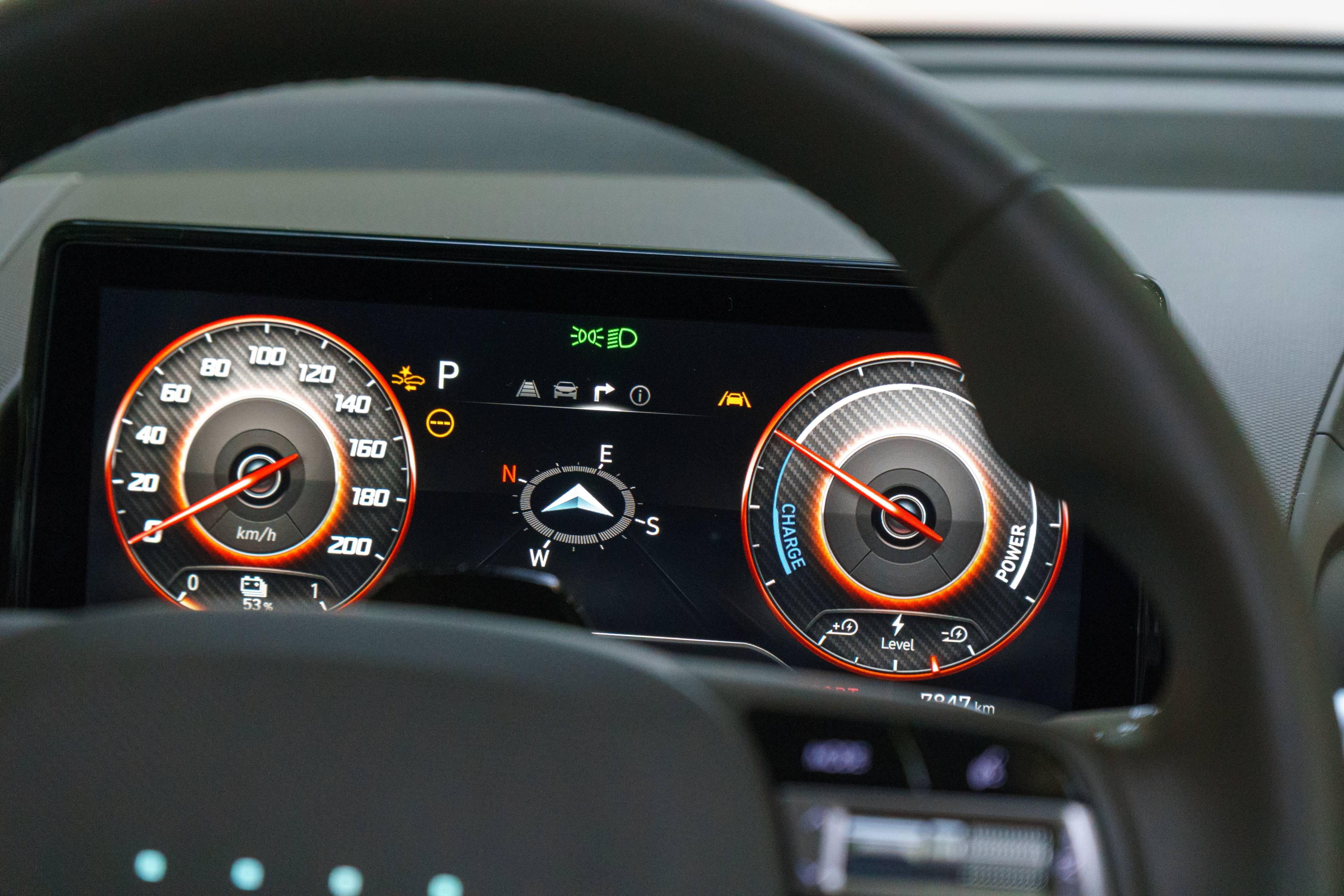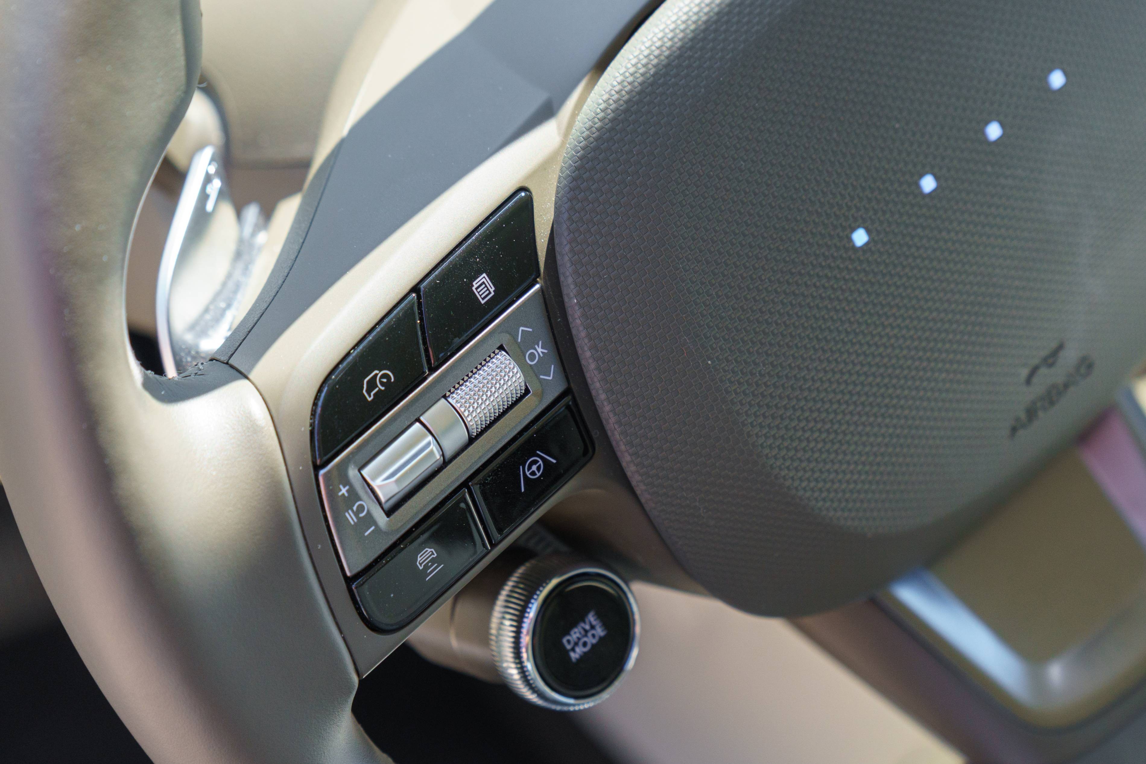 Wie ich beobachtet habe, hat dieses Hyundai -Modell ein überraschend minimalistisches Lenkrad – es fehlt das übliche Hyundai -Logo und verfügt nur über vier kleine LED -Punkte. Es ist eine jüngste Designauswahl von Hyundai, und bisher ist die Gründe dafür nicht klar. Diese Punkte beleuchten und ändern die Farbe, um den aktuellen Antriebsmodus oder den Ladezustand widerzuspiegeln, aber darüber hinaus scheinen sie keinen großen Zweck zu erfüllen.