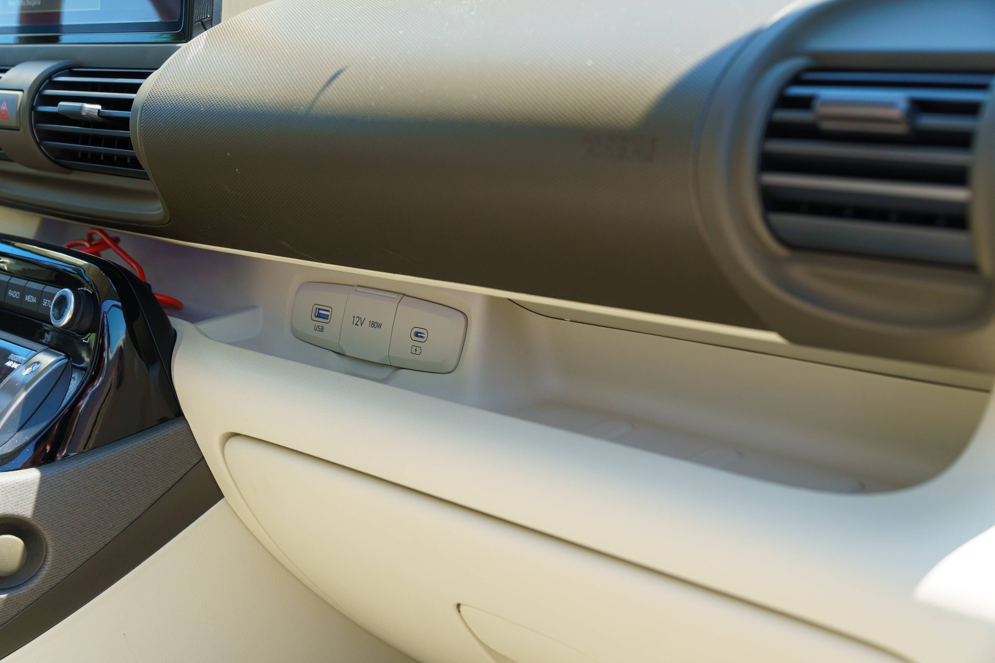 Unter den Lüftungsschlitzen läuft ein Regal vom Lenkrad zur Beifahrertür, um kleine Gegenstände aufzubewahren. Obwohl es für die Aufbewahrung nützlich ist, seien Sie sich bewusst, dass es offen ist, damit die Dinge leicht abfallen können.