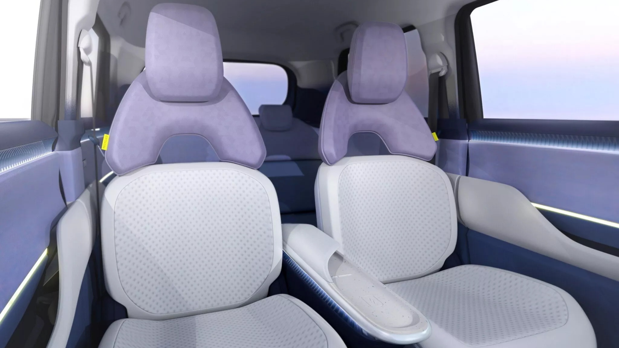 Das Lenkrad hat drei Speichen und eine quadratische Form, sodass der Fahrer eine ungehinderte Sicht auf die Anzeigen hat. Um den Innenraum zu vereinfachen, wurden viele herkömmliche Tasten durch Bedienelemente auf dem Touchscreen-Display ersetzt. Die Mittelkonsole schwebt und verfügt über ein kabelloses Ladepad für Telefone. Als spielerische Note war auf dem Armaturenbrett des Konzeptautos eine kleine Topfpflanze angebracht – ein Detail, das im Serienmodell wahrscheinlich nicht vorkommt.