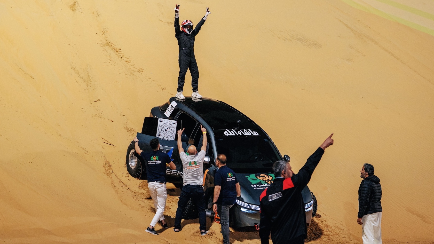Die Moreeb-Düne, auch „Hügel der Angst“ genannt, macht ihrem Namen alle Ehre. Mit einer Höhe von 984 Fuß – ungefähr der Höhe eines 90-stöckigen Gebäudes – und einer sehr steilen Neigung von 50 Grad ist es für jedes Fahrzeug eine gewaltige Herausforderung. Der weiche Sand beim Liwa International Festival macht das Klettern noch schwieriger, da er dazu neigt, Autos herunterzuziehen. Traditionell glaubte man, nur leistungsstarke Verbrennungsmotoren seien in der Lage, solch einen steilen Anstieg zu bewältigen, doch Zeekr hat kürzlich bewiesen, dass Elektrofahrzeuge über die Kraft und Fähigkeit verfügen, selbst die extremsten natürlichen Hindernisse zu überwinden.